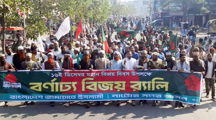 নাটোরে স্বাধীনতার ৫৫ বছর পদার্পনে মহান বিজয় দিবস উপলক্ষে বিশাল বর্ণাঢ্য র্যালি ও সমাবেশ করেছে জেলা জামায়াতে ইসলামী।মঙ্গলবার বেলা এগারোটার সময় শহরের মাদ্রাসা মোড় স্বাধীনতা চত্তরে জেলা জামায়াতের উদ্যোগে মহান বিজয় দিবসের র্যালি ও সমাবেশ করেছে জেলা জামায়াতে ইসলামী।